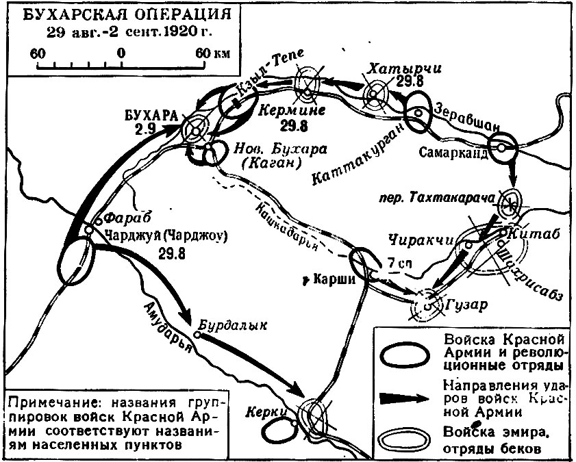 К концу лета 1920 г. вторжение российских войск в Бухару под знаменем «революции» было уже неотвратимо. К тому времени военные силы амира Алим-хана состояли из регулярной армии, которая оценивалась в 8 тыс. штыков и 7,5 тыс. сабель, имела 16 пулеметов и 23 орудия. Эти силы обороняли Старую Бухару, а также подступы к ней в районе Хатырчи-Кермине. В Бухаре также находился конвой афганского консула с одной горной батареей. Вооруженные силы бухарских беков насчитывали до 27 тыс. штыков и сабель, но имели всего 2 пулемета и 32 старых орудия. Большая часть этих сил была сосредоточена в районе Китаба–Шахрисябза, прикрывая стратегический перевал Тахта-Карача. Значительные бекские отряды были сосредоточены в Карши, Старом Чарджуе и районах Восточной Бухары.