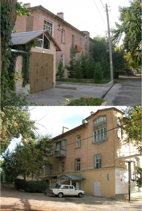 Это дом ИТР завода Узбекхлопкомаш. В нём до сих пор располагается Общество пчеловодов. Дальше вплоть до Чинабадской на обе стороны Вахшской выходят торцы бараков этого же завода. За бараками частные дома тоже работников этого завода. Вся земля в этом районе некогда была куплена Иеронимом Краузе для создания садового дачного посёлка. Поэтому называлась «Садовые участки Никольского тракта». Краузе построил там несколько капитальных дачных домов с участками по 15 соток. Вскоре их арендовали весьма известные люди историк Куна, биолог Богданов, зоолог Мышкин и др.