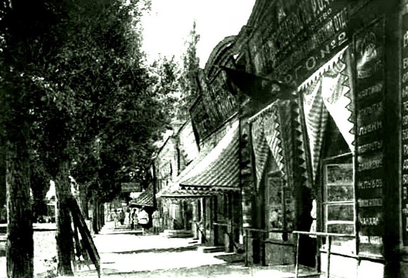 АГ! Снимки очень хорошие, но теперь очевидно на 100%, что это УЗКИТАБ (угол Пушкинской и Кирова или как при царизме Соборной и Ирджарской). Магазин на первом снимке, конечно, книжный. Он не угловой, состоит из двух отделов. В одном -книги, в ближайшем к нам плакаты, лубки… последнее слово «САХАР»? Но в витрине нечто вроде репродукций или картин? Я пыталась ликвидировать свою безграмотность, «забурилась» на сайт Евгения Смехова и прочла там много интересного.