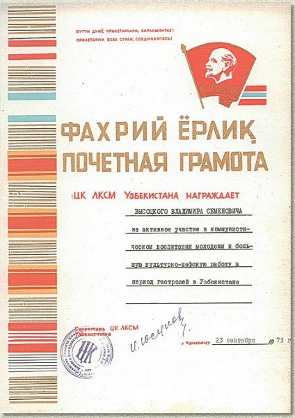 Грамота Владимиру Высоцкому от ЦК ЛКСМ Узбекистана Разное Старые фото