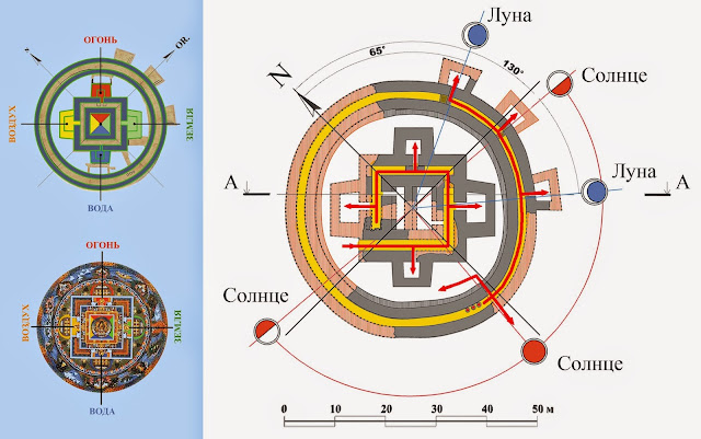 Планировка памятника Шаштепа представляет наиболее совершенную композицию, близкую к более поздним буддийским мандалам, воспринятым из общего пространства индоевропейской культуры, в более совершенном и законченном виде. Совершенность плана Шаштепа, позволяет видеть в этом, конкретное историческое событие, идею определенной личности, ознаменовавших его строительство. Сопоставление древних представлений и легенд о происхождении мира, выявило схожесть древнеиранских (Авеста) и более поздних тибетских (Шамбала) представлений о мире, а также, легенды о стране Чамбил эпического произведения узбекского народного творчества «Нурали» (Гуруглибек) [9]. Изображения Шамбалы на Тибете содержат в себе историю происхождения этой священной страны, в которой царь Сучандра отправившись в Индию и получив учение Калачакры от самого Будды, возвратившись на родину, возводит храм в виде мандалы у великой горы. Примечательно, что все изображения тибетских мандал, передают ее в виде архитектурного сооружения, храма. То есть изображения мандал на Тибет попали в виде легенды о священной стране, где построен храм в виде мандалы. Возможно, что этой священной страной была Кангха на территории Древнего Ташкента, а храмом в виде мандалы – Шаштепа, у подножия западных отрогов Тянь-Шаня. Это объясняется общим протоиндо-европейским корнем развития культуры этих регионов. Поэтому, возможно, планировка храмов Шаштепа II в. до н.э. и Мингурик I в. н.э. распространилась далеко за пределами этого региона (Биловур-тепе I-II вв. н.э. и Арк-тепе II-III вв. н.э. в Ферганской долине, Ак-тобе 2 в Чардаре I-II вв. н.э., Чоль-тобе I-IV вв. н.э., Сеталак 1 III-V вв. н.э. [3], Кайла-Санатха в Элоре в Индии VII в. н.э.). Анализ плана Шаштепы (II в. до н.э.) и тибетской мандалы (конец I тыс. н.э.), позволил реконструировать гипотетический план древнего зодчего, где центральный квадрат сооружения, на первом этапе строительства еще не перегороженный, олицетворял духовное начало: на изображениях тибетских мандал в этом центральном квадрате изображается божество. После захоронения останков человека в первом уровне здания, возможно, это помещение олицетворяющее духовное начало переносится на второй уровень. Пристроенные к сторонам этого квадрата «башни» олицетворяли четыре стихии. В одной из «башен» Шаштепа археологами был найден алтарь огня. Мощными пилонами особо подчеркнут и вход в это помещение, посвященное огню. Почитание огня занимает особое место на ранних этапах возникновения зороастризма, а в последующем занимает центральное место его культа. Три остальные башни гипотетически предполагаются помещениями почитания Воды, Земли и Воздуха. Как известно почитание стихий в зороастризме, как чистых творений Ахурамазды, составляет основу религиозно-нравственных взаимоотношений человека с окружающим его миром. Строительство сооружений в виде мандал или космограмм, является отличительной чертой культовых строений древности: храмов, погребальных строений. Это объясняется теократической направленностью государств, городов. Градообразующим объектом, которых были храмы или иные культовые постройки: Зиккураты Месопотамии, Пирамиды Египта, Пирамиды Южной Америки, ступы Индии, храмы цивилизации Маргуш и Бактрии.