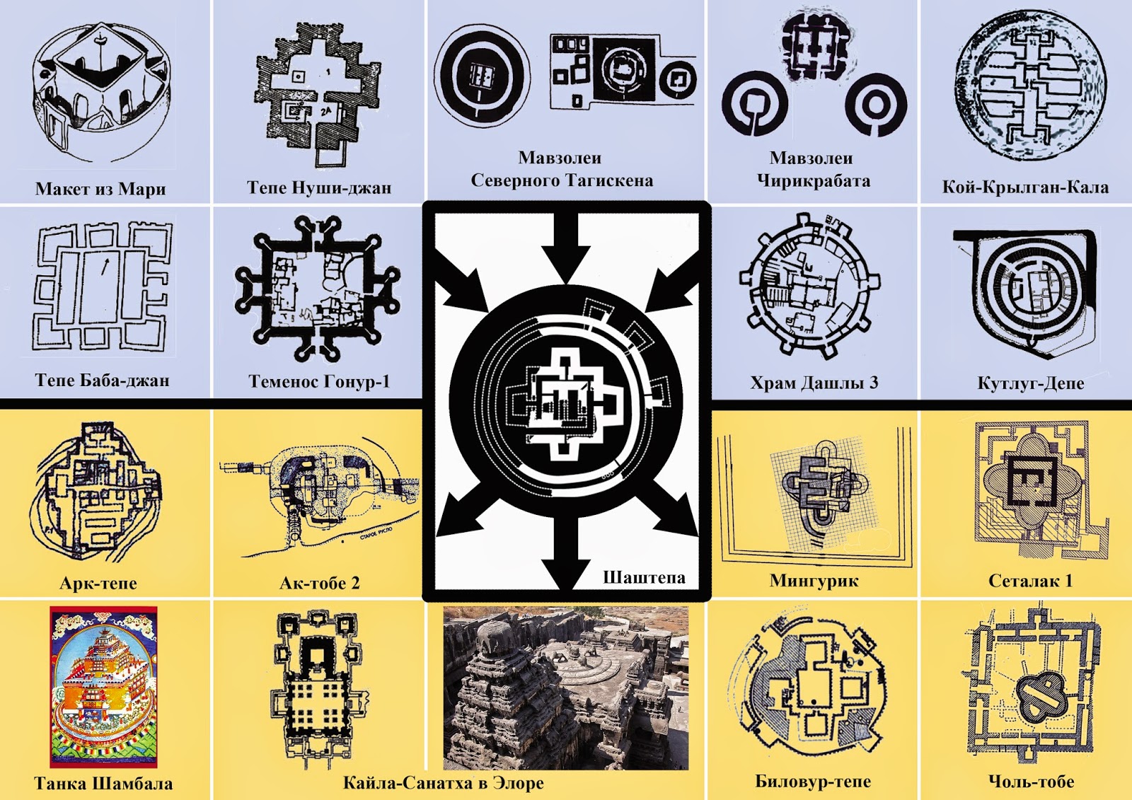 Планировка памятника Шаштепа представляет наиболее совершенную композицию, близкую к более поздним буддийским мандалам, воспринятым из общего пространства индоевропейской культуры, в более совершенном и законченном виде. Совершенность плана Шаштепа, позволяет видеть в этом, конкретное историческое событие, идею определенной личности, ознаменовавших его строительство. Сопоставление древних представлений и легенд о происхождении мира, выявило схожесть древнеиранских (Авеста) и более поздних тибетских (Шамбала) представлений о мире, а также, легенды о стране Чамбил эпического произведения узбекского народного творчества «Нурали» (Гуруглибек) [9]. Изображения Шамбалы на Тибете содержат в себе историю происхождения этой священной страны, в которой царь Сучандра отправившись в Индию и получив учение Калачакры от самого Будды, возвратившись на родину, возводит храм в виде мандалы у великой горы. Примечательно, что все изображения тибетских мандал, передают ее в виде архитектурного сооружения, храма. То есть изображения мандал на Тибет попали в виде легенды о священной стране, где построен храм в виде мандалы. Возможно, что этой священной страной была Кангха на территории Древнего Ташкента, а храмом в виде мандалы – Шаштепа, у подножия западных отрогов Тянь-Шаня. Это объясняется общим протоиндо-европейским корнем развития культуры этих регионов. Поэтому, возможно, планировка храмов Шаштепа II в. до н.э. и Мингурик I в. н.э. распространилась далеко за пределами этого региона (Биловур-тепе I-II вв. н.э. и Арк-тепе II-III вв. н.э. в Ферганской долине, Ак-тобе 2 в Чардаре I-II вв. н.э., Чоль-тобе I-IV вв. н.э., Сеталак 1 III-V вв. н.э. [3], Кайла-Санатха в Элоре в Индии VII в. н.э.). Анализ плана Шаштепы (II в. до н.э.) и тибетской мандалы (конец I тыс. н.э.), позволил реконструировать гипотетический план древнего зодчего, где центральный квадрат сооружения, на первом этапе строительства еще не перегороженный, олицетворял духовное начало: на изображениях тибетских мандал в этом центральном квадрате изображается божество. После захоронения останков человека в первом уровне здания, возможно, это помещение олицетворяющее духовное начало переносится на второй уровень. Пристроенные к сторонам этого квадрата «башни» олицетворяли четыре стихии. В одной из «башен» Шаштепа археологами был найден алтарь огня. Мощными пилонами особо подчеркнут и вход в это помещение, посвященное огню. Почитание огня занимает особое место на ранних этапах возникновения зороастризма, а в последующем занимает центральное место его культа. Три остальные башни гипотетически предполагаются помещениями почитания Воды, Земли и Воздуха. Как известно почитание стихий в зороастризме, как чистых творений Ахурамазды, составляет основу религиозно-нравственных взаимоотношений человека с окружающим его миром. Строительство сооружений в виде мандал или космограмм, является отличительной чертой культовых строений древности: храмов, погребальных строений. Это объясняется теократической направленностью государств, городов. Градообразующим объектом, которых были храмы или иные культовые постройки: Зиккураты Месопотамии, Пирамиды Египта, Пирамиды Южной Америки, ступы Индии, храмы цивилизации Маргуш и Бактрии.