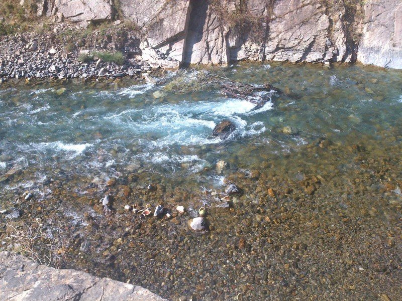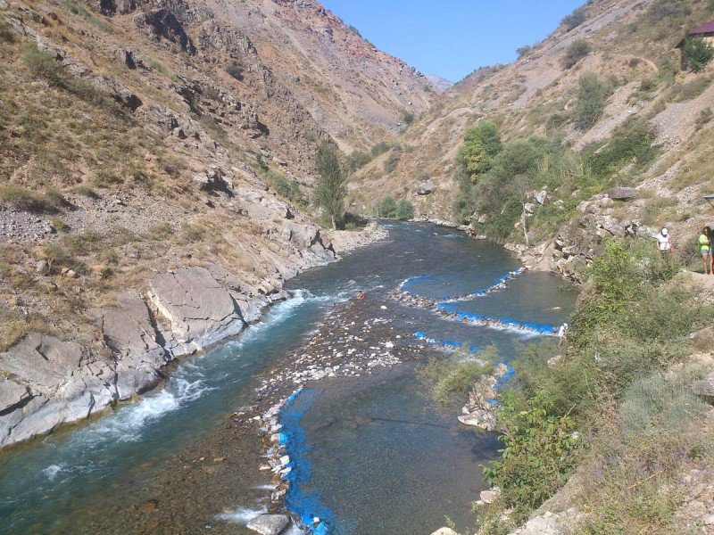 14 августа 2015 года. В чистой прозрачной реке Коксу, впадающей в Чарвак, плавает остров из баклажек (пластиковых бутылок) и пакетов.