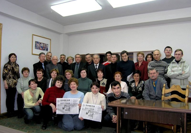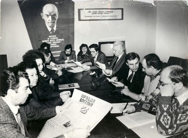 Cправа — Рашид Музамедзянов, далее Геннадий Фиглин, далее Андрей Филатов, далее редактор Рубен Акопович Сафаров, ответственный секретарь Дегтярев Виктор Петрович, женщину не узнаю, Стас Фиолетов. Слева — Алтунянц Станислав Александрович, Ляля Санджаровна, Татьяна Кулевас…Дегтярев сейчас работает в «Uzbekistan today».