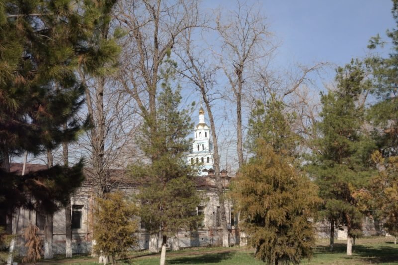 Я обратил внимание на здание со световым фонарем на крыше — возможно здесь была операционная, ведь нынешних устройств мощного электроосвещения в XIX веке не было, а дополнительное освещение нужно было. На некоторых фото видна колокольня кафедрального собора. Свято-Успенский собор является наследователем одного из первых ташкентских православных храмов — церкви во имя св. Пантелеймона, которая была домовым храмом военного госпиталя. От того храма сейчас конечно ничего не осталось.