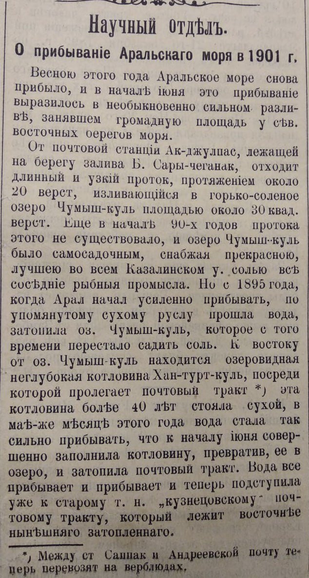 Вспомнил, что натыкался на весьма любопытную заметку в «Русском Туркестане» (11 июля 1901 г., №124). Вот, когда-то проблемы относительно Арала были совсем обратного рода.