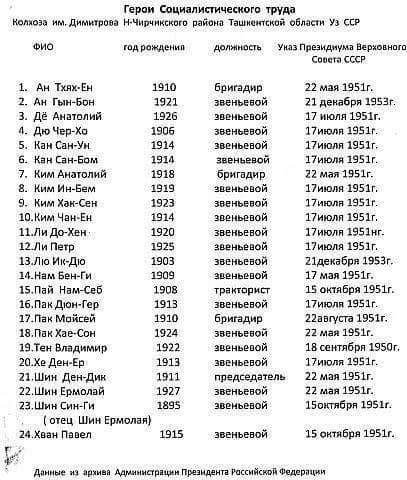 Были замечательные организаторы сельхозпроизводства из числа корейцев и в других регионах Узбекистана. Это Ню Гван Сен (имени Сталина Гурленского района Хорезмской области), Николай Васильевич Ким (директор совхоза имени Аль-Хорезми, Хорезмской области), Лим Мен Гык («Гигант» Задарьинского района Наманганской области) и др. Каждый из них был яркой, самобытной личностью, но всех их объединяло одно — искреннее, бескорыстное служение людям, народу, который приютил их. Наверное, было и стремление доказать властям, в том числе и тем, кто принимал решение о депортации, свою лояльность к Советскому государству. И доказательства эти были весьма вескими. Достаточно сказать, что в колхозе имени Димитрова звания Героя Труда были удостоены 27, Полярной звезде — 22, имени Свердлова — 20, имени Микояна — 18, имени Буденного — 16, «Правде» — 12. Столь массового присвоения звания Героя Труда не знала история советского сельского хозяйства.