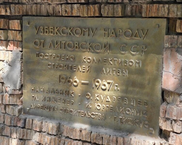 Мемориальная доска, установленная в честь строительства жилых домов, после сильнейшего землетрясения в Ташкенте (Чиланзар 24 квартал), коллективом строителей из Литовской ССР.