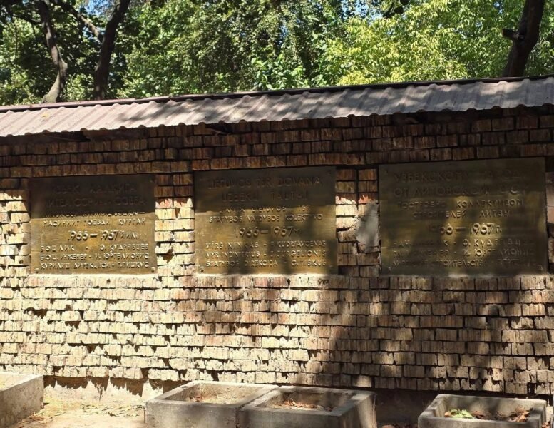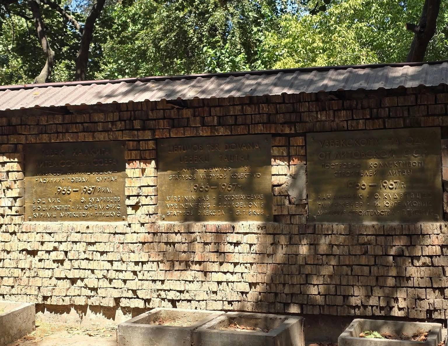 Мемориальная доска, установленная в честь строительства жилых домов, после сильнейшего землетрясения в Ташкенте (Чиланзар 24 квартал), коллективом строителей из Литовской ССР.