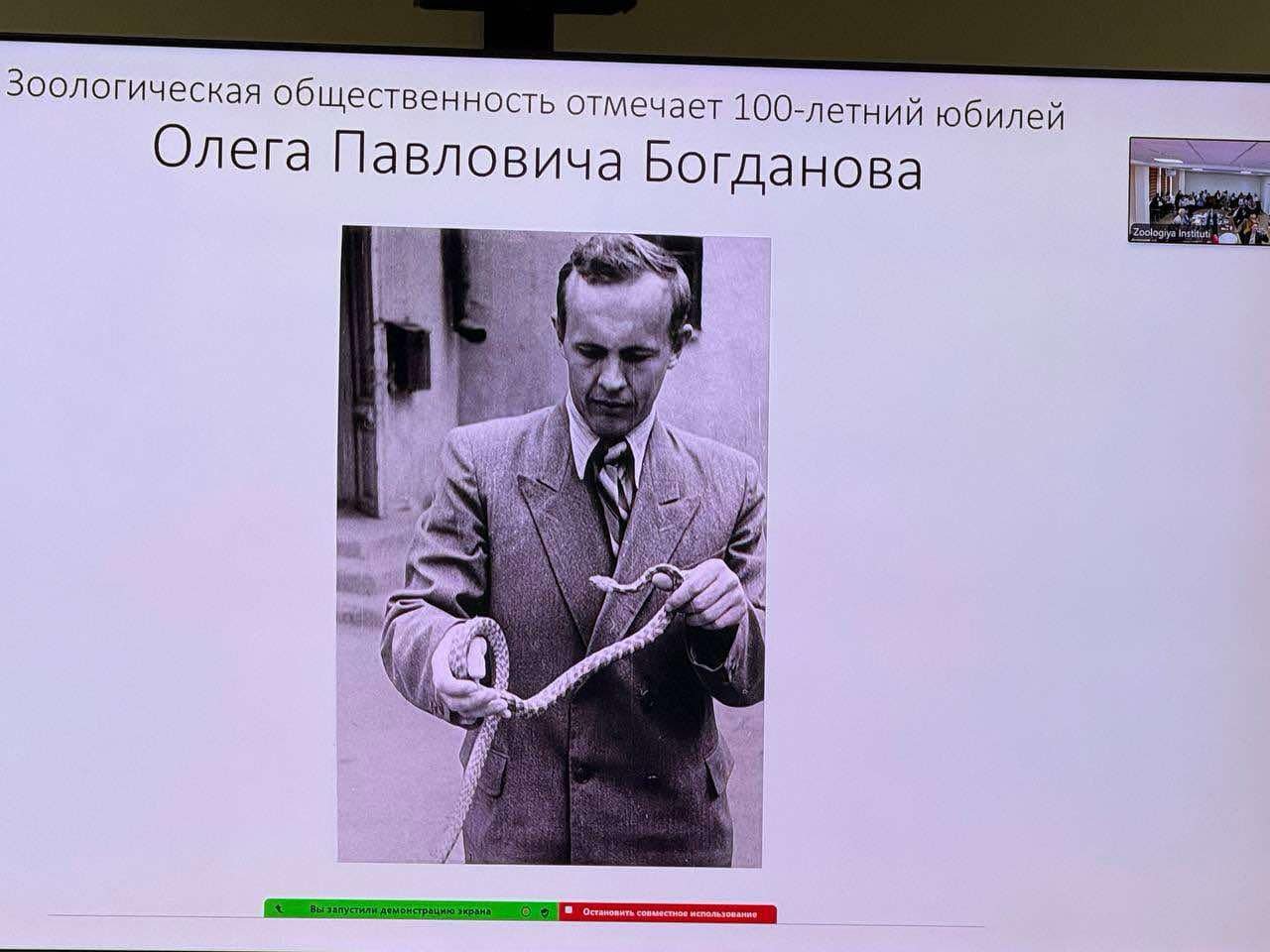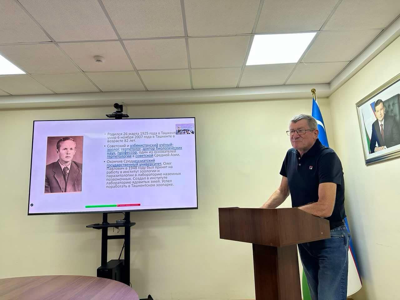 Конференция посвящена 100-летию со дня рождения выдающегося учёного, основоположника герпетологии Узбекистана, доктора биологических наук, профессора Олега Павловича Богданова. Его научный вклад и труды до сих пор остаются эталоном для зоологов Средней Азии и всего мира, а имя стало синонимом преданности науке и глубокого знания фауны региона. На конференцию приехали потомки профессора Богданова – его сноха Анна Медведева и внуки Юлия и Олег Богдановы.