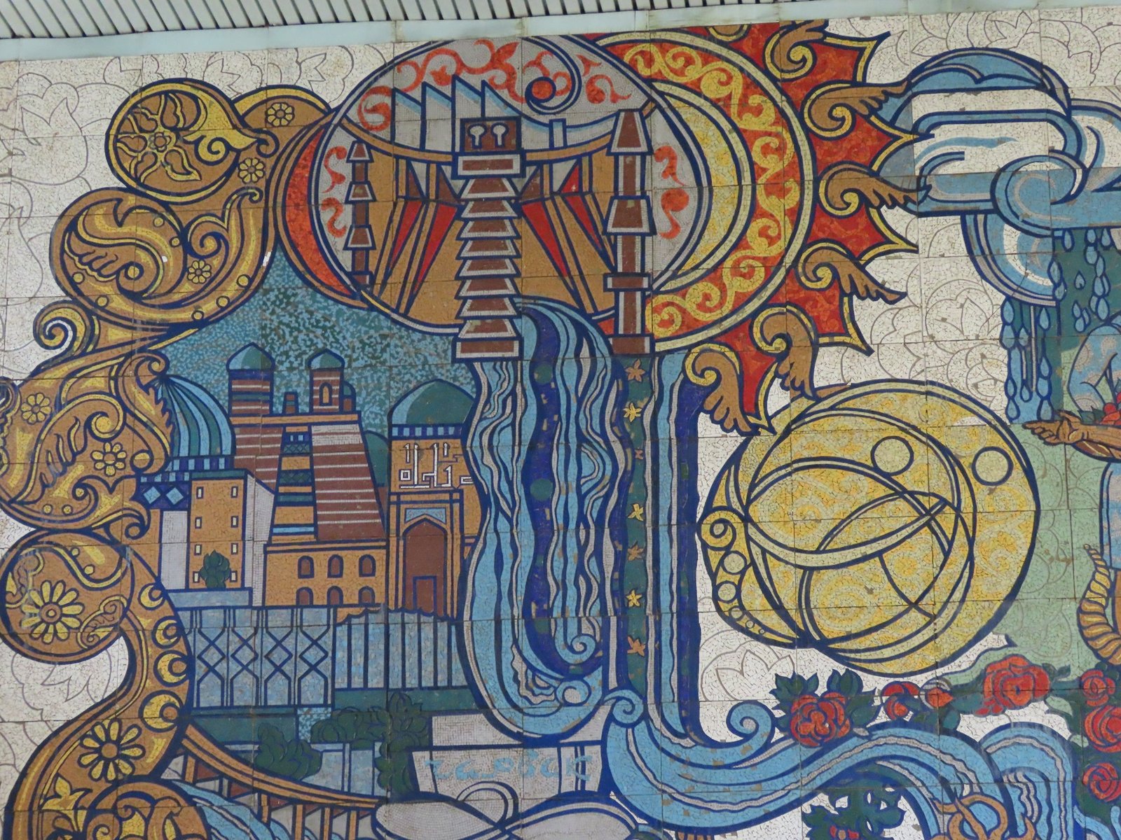 Слева изображены древние города с куполами и башнями, отсылающие к Самарканду и Бухаре — памяти веков, на фоне которых поднимаются современные сооружения, линии электропередачи и плотины — новая архитектура индустриального века.