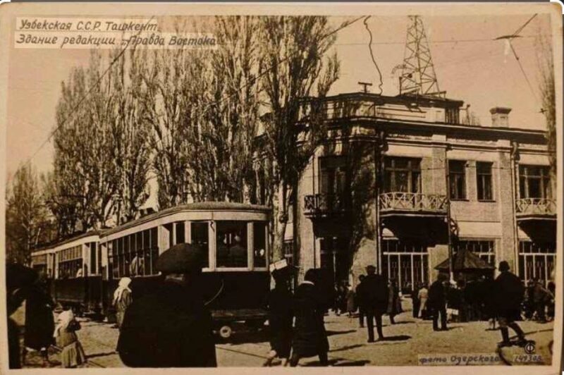 Первая фотография «смотрит» на аптеку №1. Судя потому, что аптека ещё в один этаж — фото довоенное. Гостиница будет рядом с аптекой, театральная площадь -слева, а место для театра осталось позади фотографа. Он будет построен к ул. Правды Востока боком. Второй снимок скорее всего сделан за поворотом на ул. Ленина. Трамвай направляется мимо цирка Юпатова, в сторону ул. Сталина, а потом в Старый гор. Конец улица Правды Востока мы видим справа. Сужу по коротенькому фасаду и положению радиовышки. Театр Навои построят справа в конце будущей Театральной пл.