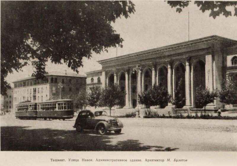 Несмотря на трудности военного времени, достраивалось по проекту академика А. Щусева здание Академического театра оперы и балета имени Навои в Ташкенте. Это сооружение является одной из выдающихся работ Щусева. Прекрасно зная архитектуру Узбекистана и будучи большим знатоком классики, автор сумел мастерски сочетать в этом сооружении монументальные архитектурные формы и мотивы народной архитектуры. В строительстве прекрасного здания театра приняло участие более 70 народных мастеров и художников из разных областей республики. В интересах театра широко использовано народное декоративное искусство Узбекистана. Особенно хорошо выполнена народными мастерами Т. Асланкуловым, Ширин Мурадовым, А. Балтаевым, К. Джалиловым, С. Наркузиевым отделка боковых фойе-залов. Эта работа проведена под руководством академика А. Щусева и архитекторов В. Засыпкина и С. Полупанова. Строительство театра было хорошей школой для архитекторов Узбекистана.