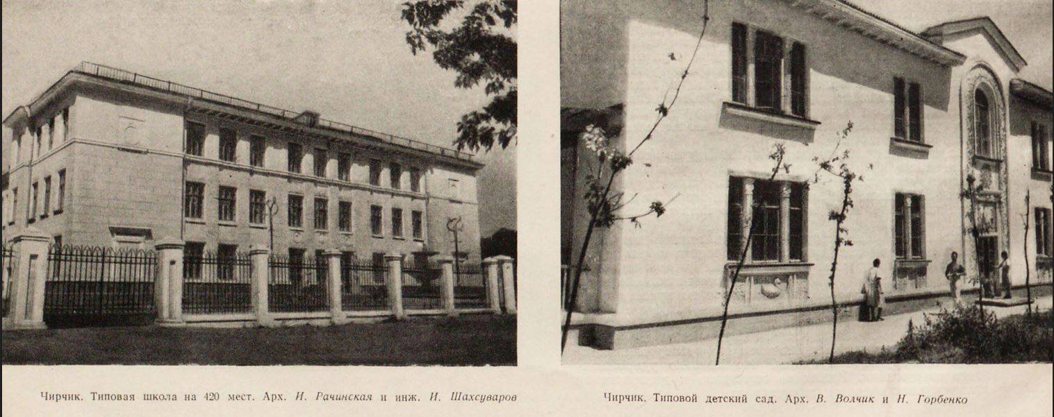 Чирчик. Типовая школа на 420 мест. Арх. И. Рачинская и инж. И. Шахсуваров. Чирчик. Типовой детский сад. Арх. В. Волчак и Н. Горбенко