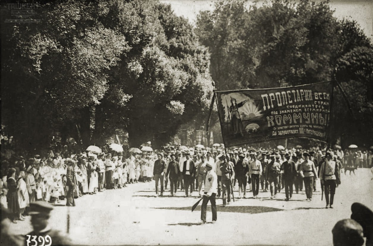 Демонстрация с лозунгами «Пролетарии всех стран соединяйтесь» под знаменем всемирной коммуны «Да здравствует III интернационал».