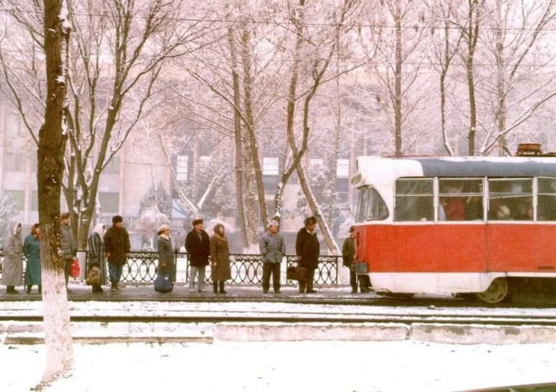 Андрей! Это работящие люди своего времени. Нищета, это когда жители города одеты в лохмотья, в лёгонькие пальтишки, в калошах на босу ногу или в летней обуви по снегу. А трамваи совсем не ходят! Здесь же все одеты по погоде, по сезону и по умеренной моде того периода. В 1996г. пассажиры иномарок — носили малиновые пиджаки, длинные чёрные пальто, их женщины — в манто и сапогах на невероятной высоты каблуках. Но эта публика в трамваях не ездила. Нищета воцарится в результате ДЕФОЛТА (август 1998).