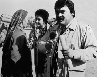 Позже, уже известного на ту пору тележурналиста, направили в тревожную командировку в Баку. В январе 1990 года, изгнанные из родных поселений Карабаха азербайджанцы, вступили в смертельную схватку с армянами. Беженцы, со своим скарбом, вереницами шли в Баку. Роковая ошибка Генсека Михаила Горбачева заключалась в том, что он ввел действующие войска в Баку и разрешил применение оружия, тяжелой техники, орудий большого калибра против мирных жителей. Мухтар-ака работал на стороне Национального фронта Азербайджана. Ганиев каждый день перегонял тревожные репортажи в программу «ВРЕМЯ». Помощь в организации съемок, перегоне, отправки материалов в Москву оказывал давний знакомый Ганиева, выпускник Бухарского духовного училища, Глава управления мусульман Шейх-уль-ислам Закавказия Аллахшукюр Пашшазаде. Рядом с ним был беспомощный Первый секретарь ЦК Азербайджана Абулфаз Эльчибей. Теперь о мужестве бакинцев. Мы видели, как молодые парни с горящими палками бросаются на солдат под автоматные очереди, разрывы гранат. Вокруг ручьи крови; трупы собирали еще ночью под пулями…