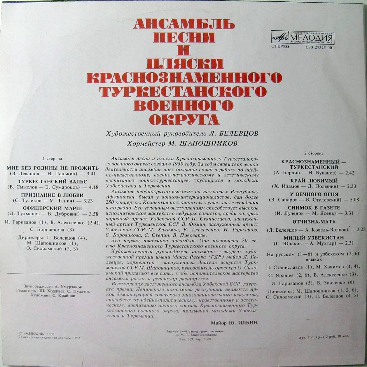 Это первая пластинка ансамбля. Она посвящена 70-летию Краснознаменного Туркестанского военного округа.