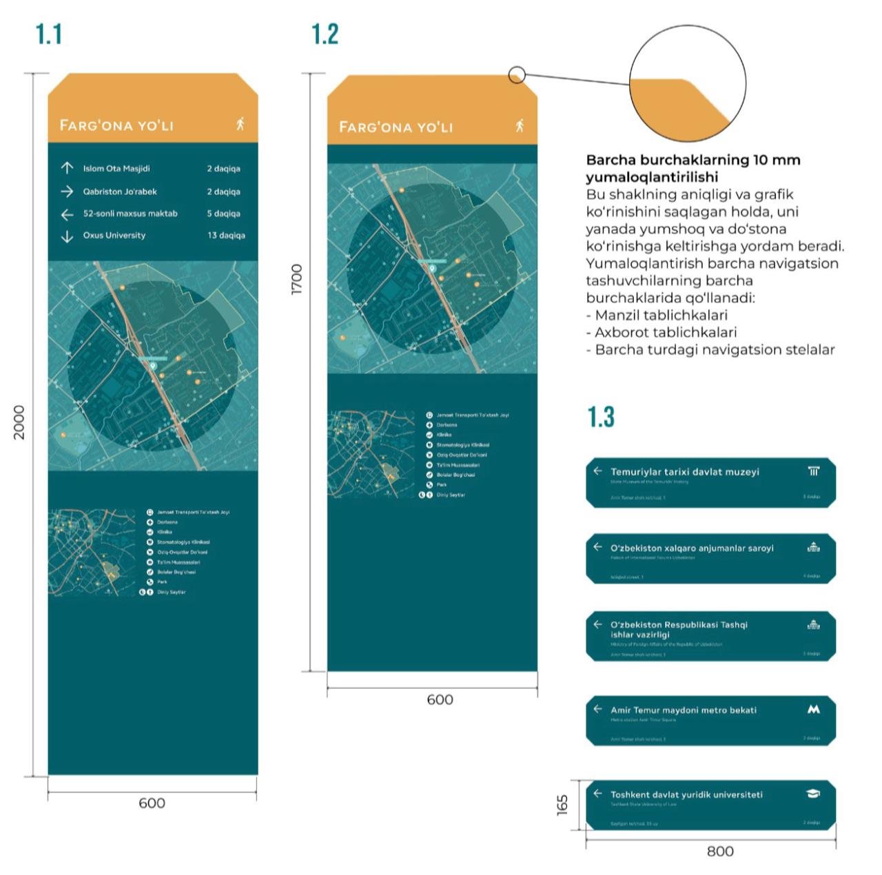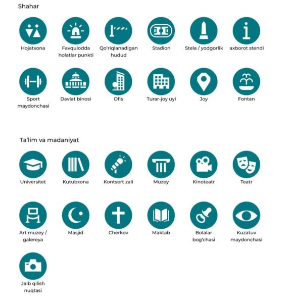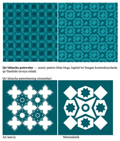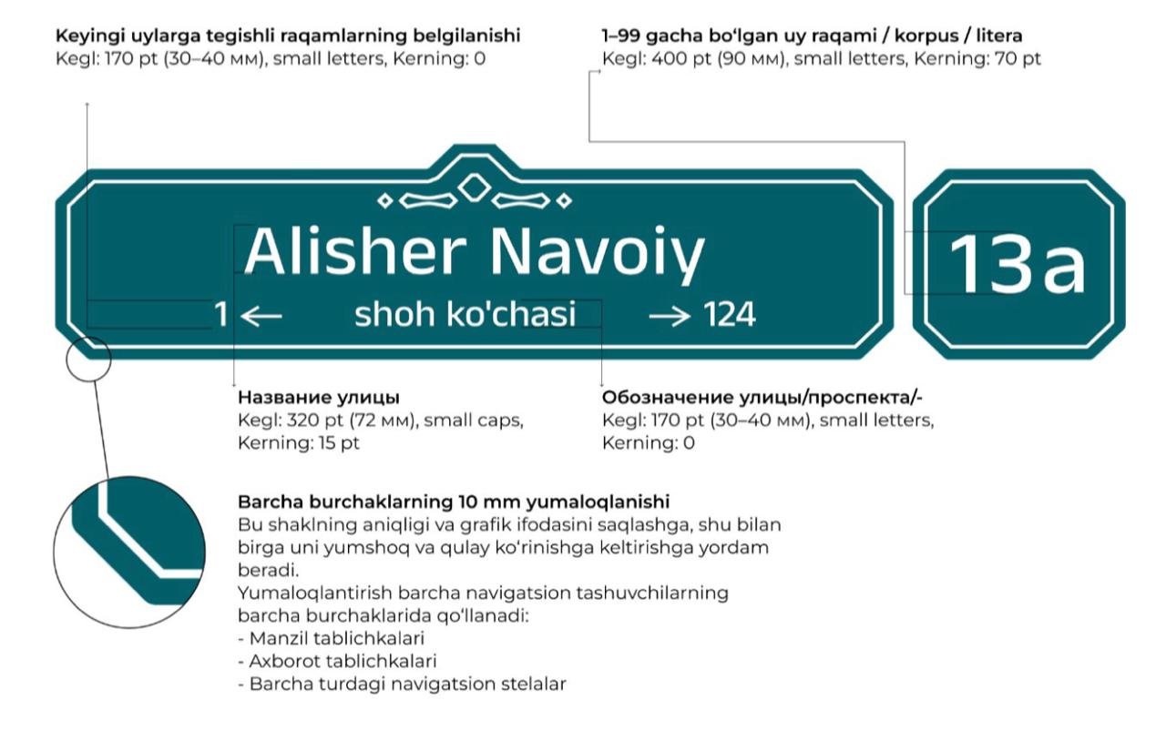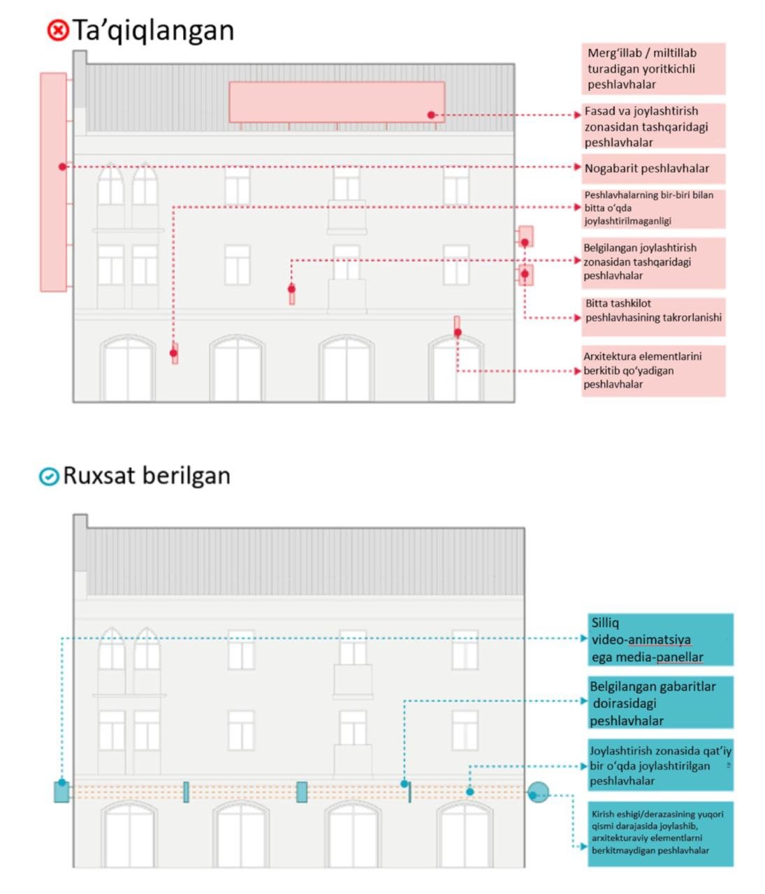 - правила размещения элементов городского дизайна Ташкента, порядок оформления коммерческих объектов, формирование визуальной идентичности города, использование прилегающих территорий, размещение конструкций и информационных средств (реклама, вывески, надписи), а также каталоги элементов городского дизайна;