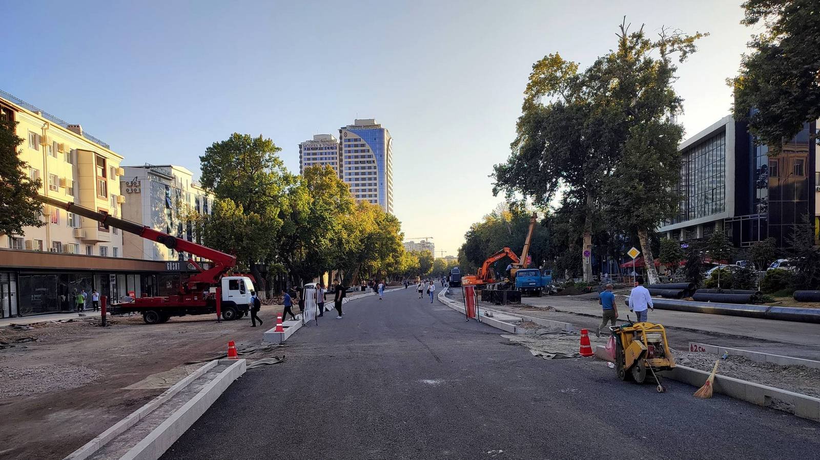 Посередине улицы будут ходить скоростные автобусы. Заодно реконструируются тротуары и подземные коммуникации, обновляются фасады домов, подземные переходы и клумбы. Работы ведёт китайская компания.