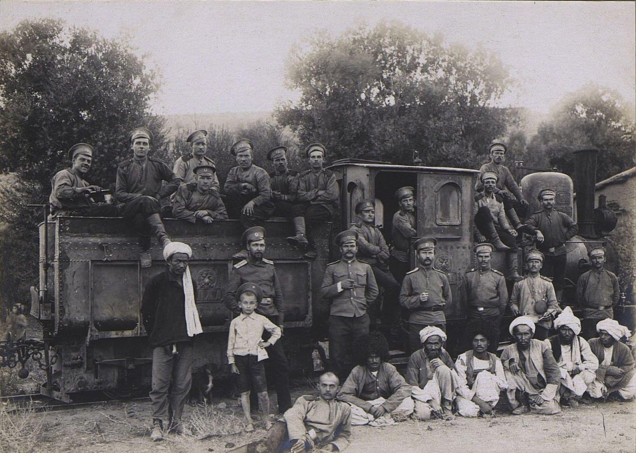 Кушкинская полевая железнодорожная рота на топографических съёмках в Туркестане. Группа военных и местных жителей у паровоза.