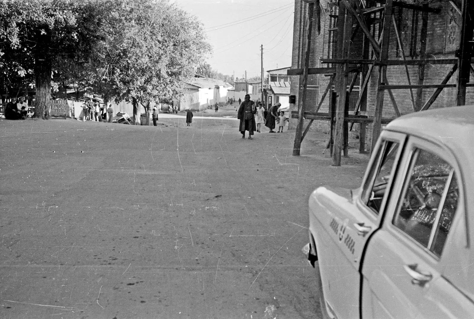 Прямо улица Заркайнар (сейчас там Центр исламской цивилизации), когда-то было улица Олча, справа медресе Баракхана, позади кинотеатр Гафура Гуляма, слева школа №23. Слева за тутовником когда-то была чайхана. Такси «Волга» ГАЗ-21.
